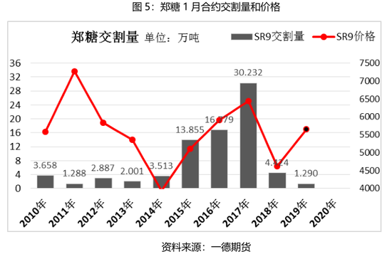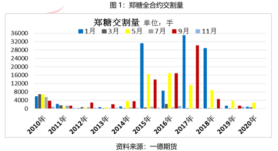 郑糖各合约十年来的交割量对比,上图可见在15年之前各个合约的交割量都维持低位,通常都不超过1万手,15年从1月合约开始交割大幅度增加,交割量最大的合约就是1月合约,其次是9月合约,最后是5月合约。18年后,市场价格走低,交割利润大幅下滑,导致交割量随着交割利润快速走低。19年至今交割量依然维持地量。