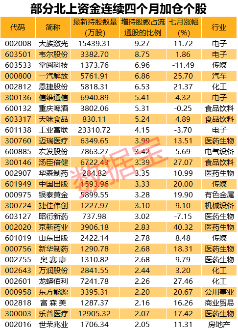 数据宝统计显示,北上资金连续四个月买入103股。分行业来看,医药生物行业个股较多,有19只。从持股比例变动情况来看,大族激光获加仓幅度最大,相比四个月前持股比例增加了9.27个百分点;其他加仓较多的还有韦尔股份、掌阅科技、一汽解放、恩捷股份等。