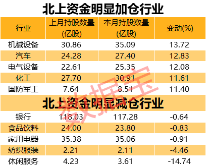 减仓的行业中,休闲服务行业减仓最为明显,七月末北上资金持有该行业3.61亿股,环比下降14.74%;减仓较多的其他行业包括纺织服装等。