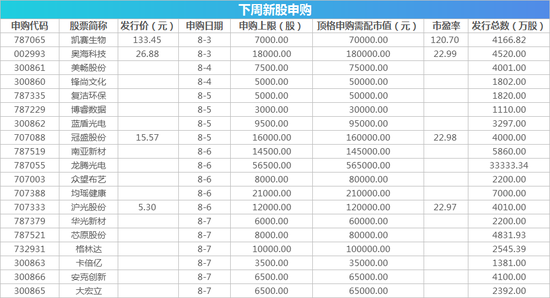 8月3日发行的是凯赛生物、奥海科技;8月4日发行的是美畅股份、锋尚文化;8月5日发行的是复洁环保、博睿数据、蓝盾光电、冠盛股份;8月6日发行的是南亚新材、龙腾光电、众望布艺、均瑶健康、沪光股份;8月7日发行的是华光新材、芯原股份、格林达、卡倍亿、安克创新、大宏立。