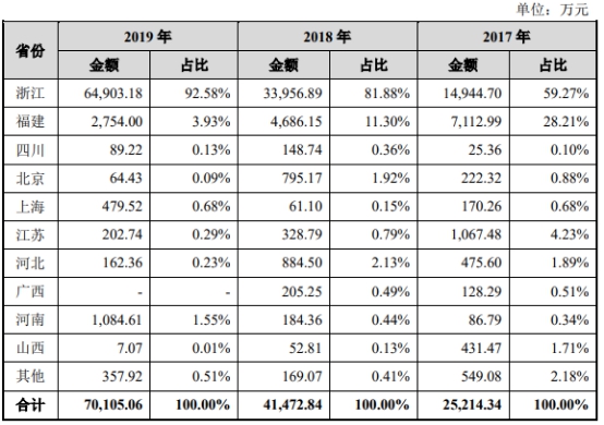 宏力达的业务越来越集中在浙江省。2017年至2019年,宏力达在浙江省实现的销售收入占主营业务收入的比例分别为59.27%、81.88%和92.58%。