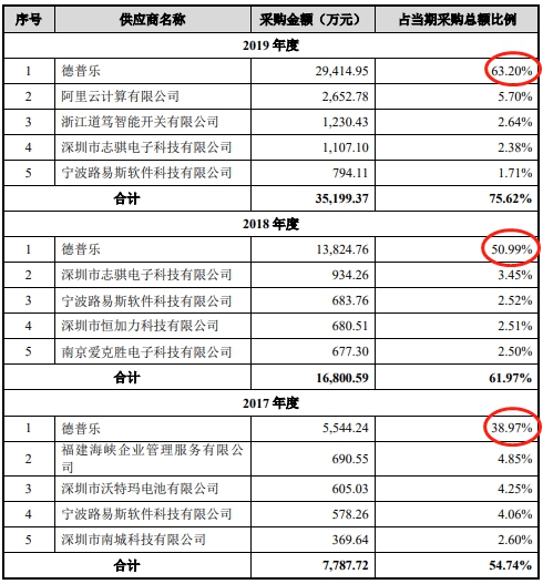 过去3年,德普乐均系宏力达的第一大供应商。2017年-2019年,宏力达向德普乐采购的金额分别为5544.24万元、1.38亿元和2.94亿元,分别占宏力达同期总采购金额的38.97%、50.99%和63.20%。宏力达的智能柱上开关包括开关本体、控制终端和研判软件三个部分,开关本体委托德普乐装配加工。