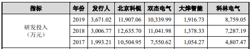 宏力达研发费用率一路下滑,但同行一路上升。从研发费用金额来看,宏力达研发费用远低于北京科锐、双杰电气、科林电气,仅高于大烨智能。2017年-2019年,北京科锐研发费用分别为1.05亿元、1.26亿元、1.19亿元,双杰电气分别为0.76亿元、1.10亿元、1.03亿元,大烨智能分别为1054.27万元、1378.33万元、1916.73万元,科林电气分别为4807.47万元、7287.19万元、8759.05万元。