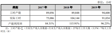 2017年-2019年,宏力达按生产人员工时计算的产能利用率分别为84.31%、115.91%、96.23%。