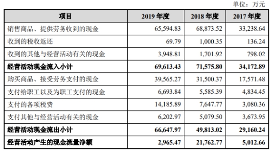 2017年至2019年,宏力达营业收入分别为2.52亿元、4.15亿元、7.05亿元,归属于母公司净利润分别为3219.53万元、9747.38万元、23858.76万元。同期销售商品、提供劳务收到的现金分别为3.32亿元、6.89亿元、6.56亿元,经营活动产生的现金流量净额分别为5012.66万元、21762.77万元、2965.47万元。