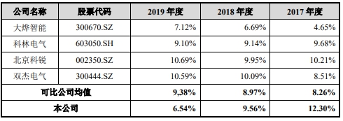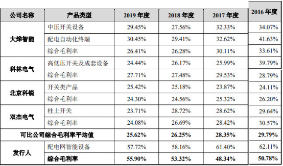 宏力达招股书称,发行人的业务及产品目前尚无严格可比的上市公司,传统开关类生产企业普遍毛利率较低,而业务模式较为创新的上市公司中,柱上开关类产品业务较少或未单独披露。大烨智能、科林电气、北京科锐、双杰电气均有开关类产品,其开关类产品毛利率在25%~30%之间,报告期内,公司的智能柱上开关毛利率约为56%,明显高于同行业上市公司的开关类产品。公司的智能柱上开关为行业内具有先进性的物联化、智能化和集成化的智能设备,深度融合了一二次设备、传感器、网络设备、通信设备,产品附加值高,市场竞争小,产品售价较高,因此其毛利率显著高于同行业的传统开关类产品。亿嘉和的主营业务是为电力系统提供以数据采集处理为核心的巡检机器人,虽然亿嘉和不经营开关类设备,但其产品在细分领域内较为领先,经营模式较为创新,与公司有类似特点。2017年至2019年,亿嘉和的毛利率为67.22%、61.55%和63.64%,毛利率较高,系亿嘉和产品技术和质量较为领先的体现。公司智能柱上开关在一二次融合领域内具有较强的技术优势,因此具有较高的销售毛利率。