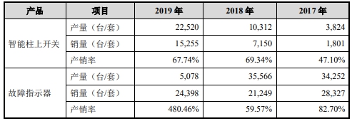 2017年-2019年,宏力达智能柱上开关产量分别为3824套、10312套、22520套,销量分别为1801套、7150套、15255套,产销率分别为47.10%、69.34%、67.74%。