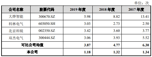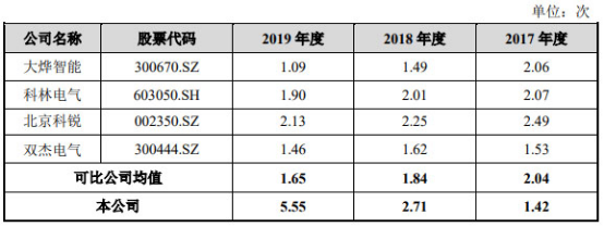 宏力达2017年度至2019年度,应收账款周转率分别为1.42、2.71和5.55;同行可比公司均值分别为2.04、1.84、1.65。