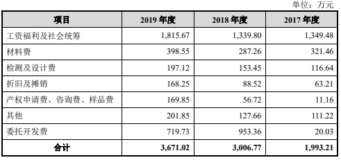 2017年-2019年,宏力达研发费用分别为1993.21万元、3006.77万元、3671.02万元,占营业收入比例分别为7.90%、7.25%、5.21%。可比公司研发费用率均值分别为3.99%、4.73%、5.18%。