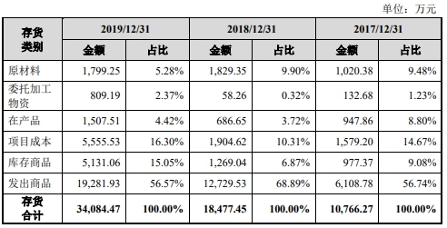 2017年-2019年,宏力达存货金额分别为1.08亿元、1.85亿元及3.41亿元,占流动资产的比例较高,分别为20.75%、24.08%和38.49%。