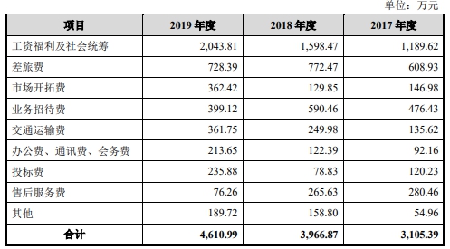 宏力达招股书称,报告期内,公司受业务拓展的实际执行情况影响,销售费用率呈下降趋势。销售费用率与同行业可比公司的差异主要系:1)2017年度,公司配电网智能设备业务快速发展,公司于2016年四季度设立杭州分公司并大规模招募售后运维和地区推广人员至各项目地实施地区推广、技术支持和运维服务,使得公司销售费用职工薪酬、差旅费等销售费用显著增加,且2017年度公司营业收入受项目投运时间的影响,确认金额较少,使得销售费用率较同行业高;2)2018年度至2019年度,随着公司的业务快速发展,营业收入规模扩大,规模效应逐步显现,销售费用率呈现出下降趋势。