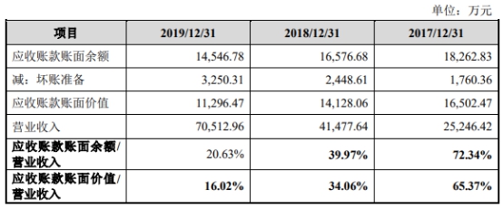 2017年-2019年,宏力达应收账款账目余额分别为1.83亿元、1.66亿元和1.45亿元,占营业收入的比例分别为72.34%、39.97%和20.63%。