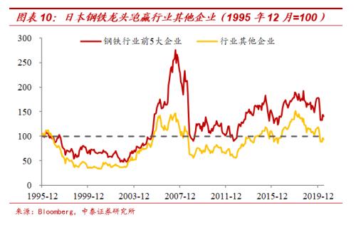 比如日本的钢铁行业,前五大上市钢企的行情是一直跑赢行业内其他企业的,在将近25年的时间里,龙头钢企还能有40%的收益率,而非龙头企业却几乎零收益。