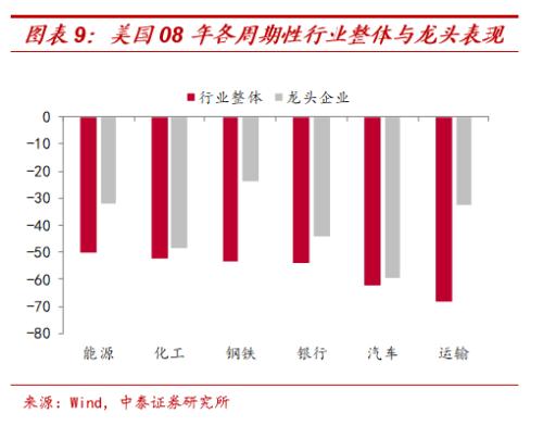 2、周期龙头确实相对更好。在经济下行周期中,周期类资产整体会面临较大的压力,但由于行业内部的分化也会加快,周期行业中的龙头资产会有相对较好的表现。比如在美国07-08年的经济衰退期,以及日本90年代之后经济低迷时期,周期行业龙头企业表现都比非龙头要好很多。