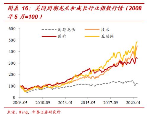 我们同样考察了韩国和美国的情况,结果也是类似的。例如,过去十多年美股大牛市,但周期龙头几乎一分未涨,技术、医疗、互联网等领域却不断创新高。
