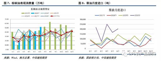 从油脂间价差来看,当前的高菜豆价差及低豆棕价差均指向性价比较高的豆油替代。不过从棕榈油表观消费量来看,4-6月表观消费量均好于去年同期水平,并未看到太明显的豆油替代情况。而至于豆油对菜油的替代,可能有一部分,但菜油年消费从400万吨出头降至300万吨上下,折月替代量不过10万吨,这部分替代量还需被玉米油、葵油等共同瓜分,从葵油进口量变化及企业反馈情况来看,同样定位中高端的葵油可能才是替代菜油的主力。海关数据显示,2020年上半年国内葵油进口91万吨,较去年同期增加36.5万吨,增幅较为明显。