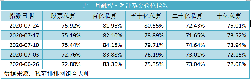 除融资客持续加仓外,私募也在7月份加仓明显。私募排排网组合大师数据显示,截至7月24日,股票私募整体仓位指数为75.92%,环比前一周加仓了0.73个百分点,其中53.64%的股票私募仓位超过八成,仅15.32%的股票私募仓位低于五成。分规模来看,五十亿股票私募加仓幅度最大,近一年仓位指数首次突破80%,环比加仓了1.66个百分点;百亿私募私募占比为66.76%。