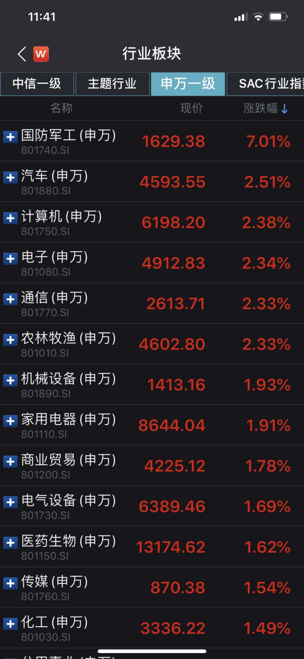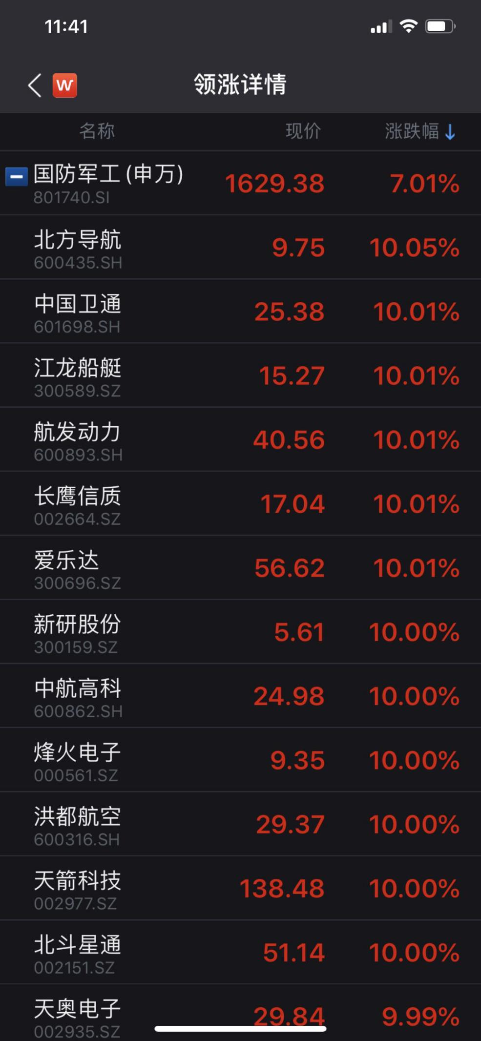 领涨的国防军工板块上演涨停潮,板块内北方导航、江龙船艇、长鹰信质、航发动力、中国卫通、爱乐达、烽火电子、洪都航空等十多只股票涨停。