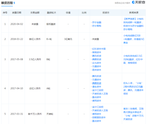 据天眼查信息显示,自成立以来,小电科技先后获得5轮融资,包括来自国内十余家一线VC以及腾讯、苏宁易购的投资。2018年3月,小电科技完成了B+轮数亿元融资,至此小电在共享充电行业估值超过3亿美金。