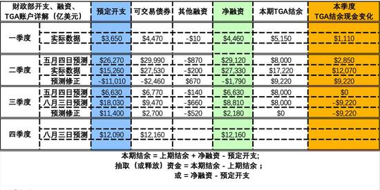 首先,就广受关注的财政部在美联储一般账户(TGA)存有海量现金的问题,财政部延续上一季度观点,坚持三季度结束时TGA账户结余现金只留8000亿美元。因此,综合参考财政部预定开支1.803万亿,上期结余现金1.722万亿,本期预定结余8000亿,三季度整体融资规模在8810亿美元,刨去660亿美元还款,财政部需要发行9470亿美元可交易债券来融资。参考图1,计算方法如下:本期结余(8000亿)=上期结余(1.722万亿)+本期净融资(9470亿- 660亿)-本期开支(1.803万亿)但另一方面,财政部TGA账户的变动与市场流动性息息相关。TGA现金增加即为从市场抽走流动性,反之TGA现金下降则为向市场释放流动性。因此两个季度间,TGA账户结余现金的变化对预测市场流动性走向至关重要。