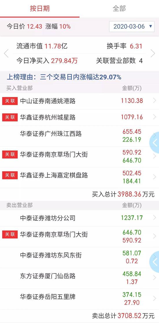 复盘龙虎榜数据,从第一波“割韭菜”来看,多次出现了疑似关联席位,如在3月6日公布的龙虎榜数据来看,买一、买二、买四和买五疑似关联席位。在3月9日的涨停来看,买一到买四疑似关联席位。3月10日,股价跌停,卖方席位中,除了卖四之外,其余4个也疑似关联席位。