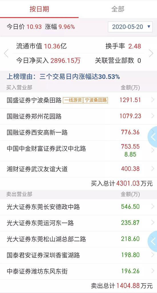 从第二波“割韭菜”来看,5月20日股价是此波最后一个涨停,买一的国盛证券宁波桑田路是一线游资席位,卖方出现3个东莞的席位,分别是卖一到卖三的,光大证券东莞长安德政中路、光大证券东莞运河东一路、光大证券东莞松山湖总部二路,而国立科技的注册地址也是在东莞。在5月25日的龙虎榜中,买方出现3个疑似关联的席位,惊讶的是,卖一竟然是一线游资席位国盛证券宁波桑田路,这次该一线游资是否也被割了韭菜呢?