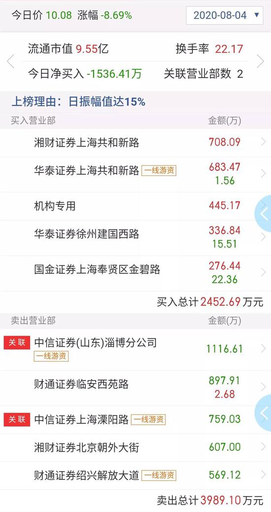 而从今天公布的龙虎榜来看,一线游资和涨停敢死队有5个席位,一线游资席位是买二的华泰证券上海共和新路,卖一的中信证券(山东)淄博分公司、卖三的中信证券上海溧阳路、卖五的财通证券绍兴解放大道,涨停敢死队席位则是买五的国金证券上海奉贤区金碧路。这次一线游资和敢死队会不会被“割韭菜”呢,明天就知道了。