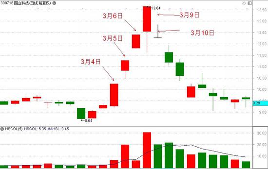 今年3月以来,国立科技的走势可谓是有一些特别,出现了3次连续涨停,之后都出现了大跌。看到上面的走势图,就能体会到,没有强大的心理素质不敢玩这样的股票。