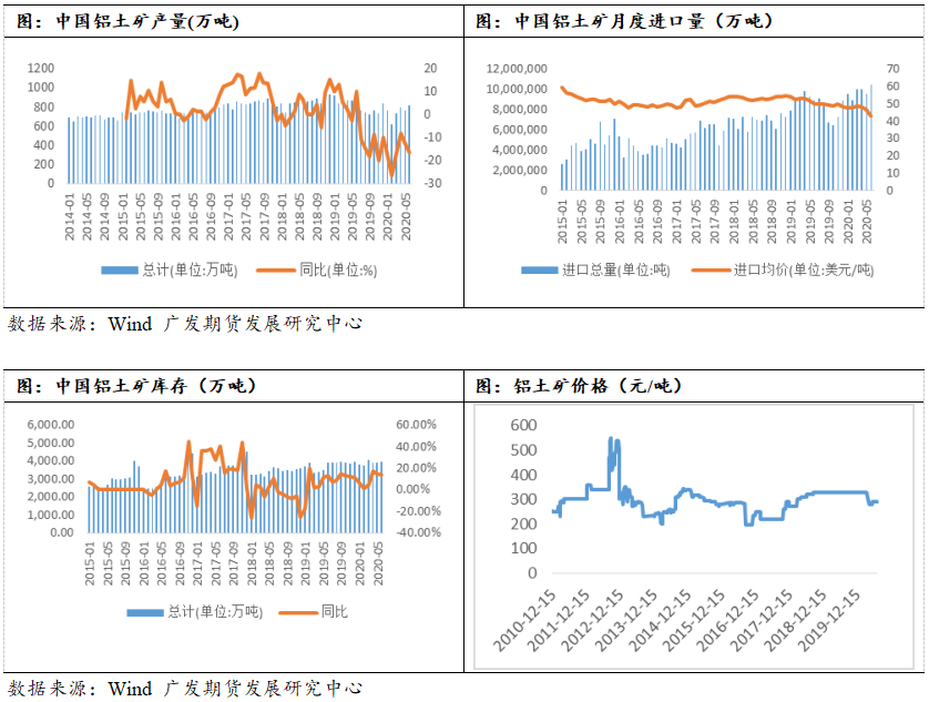 总体6月国内铝土矿供应量达1859万吨,与去年同期差不多。6月份国产铝土矿814.83万吨,同比减少16.3%,环比增加7.1%。据中国海关,2020年6月我国共进口铝土矿1043.8万吨,较去年同期增长17.6% ,环比增加9.3% 。