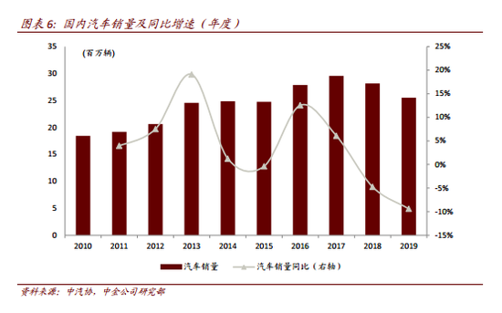 但值得注意的是,2016年到2019年我国汽车销量处于增速回落的过程,2018年行业销量出现1990年以来首次负增长,2019年汽车销量同比增速已下滑至-8.20%。