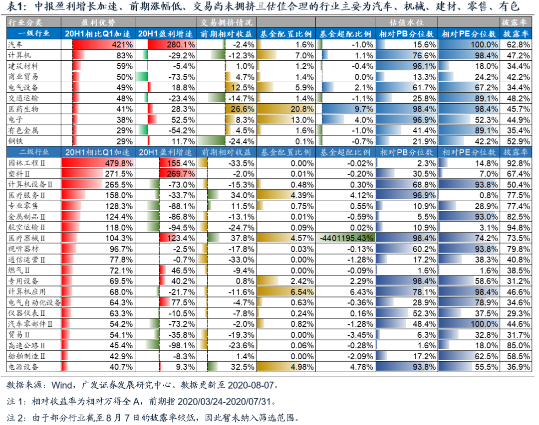 (四)继续沿着中报业绩预告的最新线索把握疫情受损链修复的合理估值品种。截止8月7日收盘,A股剔除金融中报业绩预告披露率达到40%(披露公司净利润占比40%),具有一定的代表性:(1)中报业绩预告披露率超过30%(披露公司净利润占比30%)的一级行业中,中报盈利增速相较一季报加速超过30%、相对估值处于50%分位数以下、基金未明显超配、且前期相对涨幅有限的行业主要集中在:汽车、建材、商贸、交运、有色等;(2)中报业绩预告披露率超过30%(披露公司净利润占比30%)的二级行业中,中报盈利增速相较一季报加速超过30%、相对估值处于50%分位数以下、基金未明显超配、且前期相对涨幅有限的行业主要集中在:园林工程、塑料、专业零售、航空运输、通信运营、仪表仪器、高速公路等。(3)参考8.2《内循环骑牛:如何指导投资?》,上述“盈利修复”确定性高且估值合理、基金低持仓的板块中,同时符合“内循环”方向的有:建材、交运、有色。