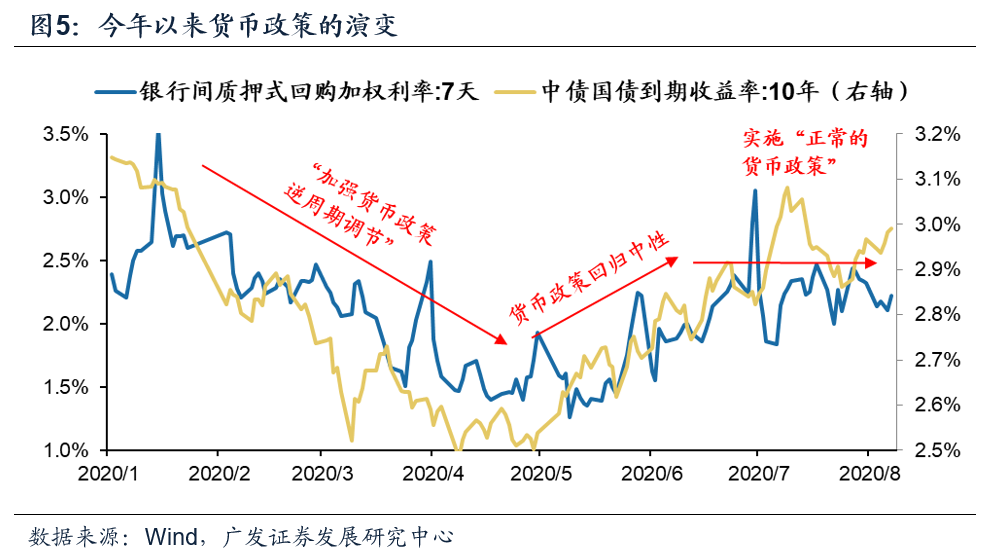 (三)中国央行二季度货政执行报告维持货币信用“弱双宽”的格局不变。(1)央行强调实施“正常的货币政策”——我们自5.24《货币信用“弱双宽”对A股的启示》判断货币和信用“弱双宽”格局。本周央行二季度货币政策执行报告设立专栏《怎样看待全球低利率》,提示全球过低利率带来的负面效果,强调货币政策回归中性:货币政策短期内既不会边际收紧,也不会继续大幅宽松。(2)央行对通胀的判断也比较中性,当前工业品涨价难成为金融条件宽松的约束条件,我们维持“四季度货币政策趋势收紧可能较大”的判断——我们在6.7A股中期策略展望《渐入佳境》中提出金融条件宽松的约束条件:A股非金融企业单季利润增速由负转正。央行货币政策执行报告中判断当前“物价涨幅总体下行,不存在长期通胀或通缩的基础”。我们认为:4季度A股剔除金融的单季利润增速转正的概率较大,货币政策可能在4季度趋势收紧。(3)短端利率走势,也和“货币政策回归中性”的基调一致:5-6月短端利率回升是为了防止金融空转套利,并非经济修复到正常水平后的趋势性收紧——央行一季度货币政策执行报告强调“加强货币政策逆周期条调节”对冲疫情导致的“业绩减记”压力,央行二季度货币政策执行报告改成实施“正常的货币政策”,5-6月短端利率震荡回升,7月以来短端利率震荡走平。