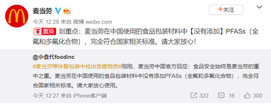 此前据外媒报道,在麦当劳、汉堡王及Wendy‘s等主要快餐店的食品包装中,发现有毒物质PFAS(全氟烷基和多氟烷基物质),可能会对人体健康造成影响。对此,麦当劳已在微博回应:在中国使用的食品包装材料中没有添加PFASs(全氟和多氟化合物),完全符合国家相关标准。