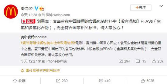 消息发布后,引发大量关注。12时28分,麦当劳官方微博转发相关消息,并评论称:“麦当劳在中国使用的食品包装材料中没有添加PFASs(全氟和多氟化合物),完全符合国家相关标准。请大家放心!”