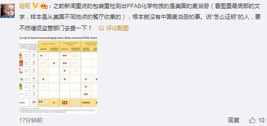 中新经纬客户端注意到,在评论中,不少网友表示支持麦当劳,有网友称,之前新闻里说的包装里检测出PFAS化学物质的是美国的麦当劳,根本就没有中国麦当劳的事。还有网友调侃“金拱门扛下了所有”“你们说的麦当劳,关我金拱门什么事?”