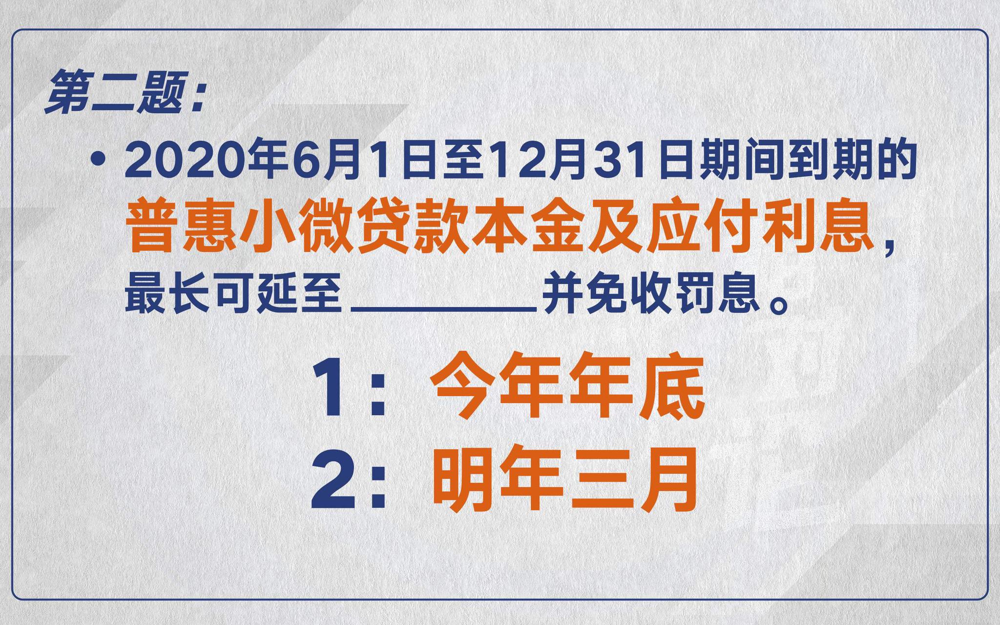 孙艳:答案是明年三月。受疫情影响,今年很多小微企业贷款还本压力大,央行特意出台了延期还本付息的政策。这一政策预计可覆盖的贷款本金大约是7万亿元,央行明确提出应延尽延。