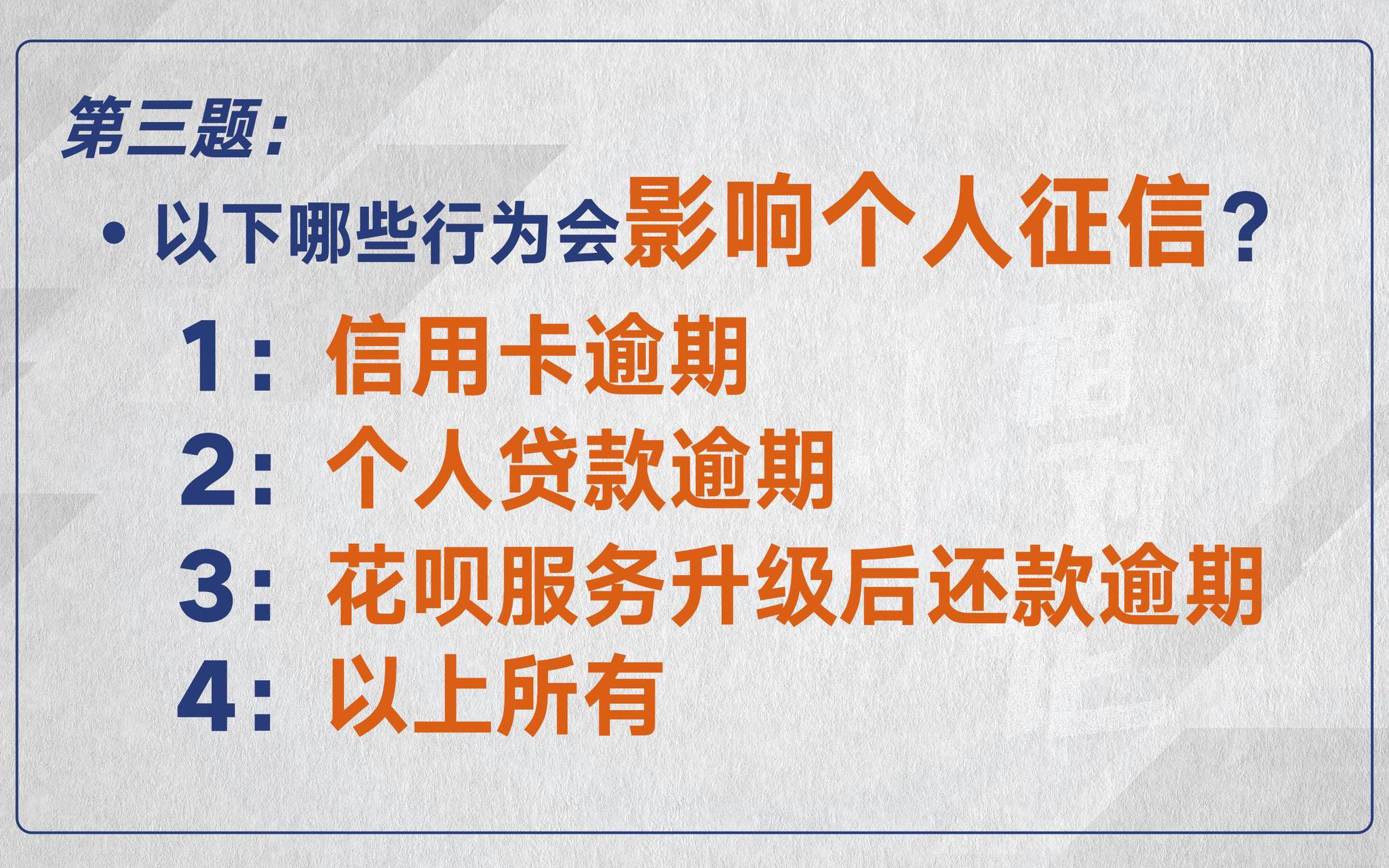 孙艳:答案是以上所有。个人征信相当于我们的“经济身份证”,影响贷款等方方面面。根据新的政策,不光信用卡逾期,花呗延期也会被记入个人征信。大家千万要爱惜这张重要的“经济身份证”。