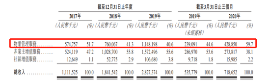 2017至2019年,融创服务的物业管理业务收入分别为5.75亿元、7.6亿元、11.48亿元,在总收入中的占比分别为51.7%、41.3%、40.6%。2020年前三个月实现收入4.29亿元,同比增加79.5%。