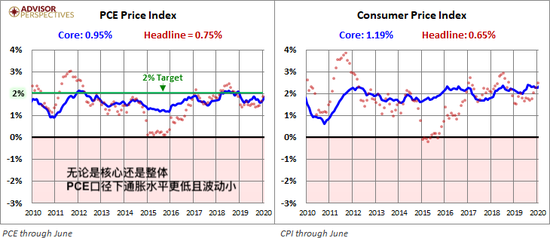 在结果上,两种指数均对核心通胀(core)与整体通胀(headline)加以区分。前者剔除了食品、油气等周期性波动大的商品。而历史上PCE统计的结果往往小于CPI,且无论是核心和整体,PCE波动范围均小于CPI。详细对比可参见随附诸图。