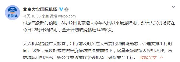 另一方面,交通运输相关单位早已对即将到来的暴雨做好准备。北京大兴国际机场方面,全天计划取消航班149架次;首都机场方面,截至13时,已执行343航班架次,取消142架次。两大机场提醒旅客,及时关注天气变化和航班动态,合理安排出行时间。