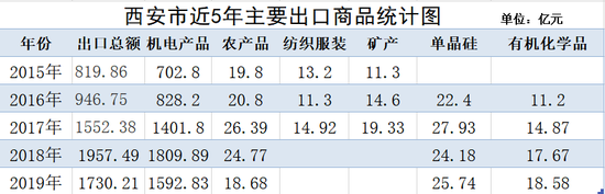 西安市统计局披露的信息显示,2016年开始,单晶硅片和有机化学品异军突起,分别出口22.4亿元和11.2亿元,单晶硅片自此位列第二大出口商品。