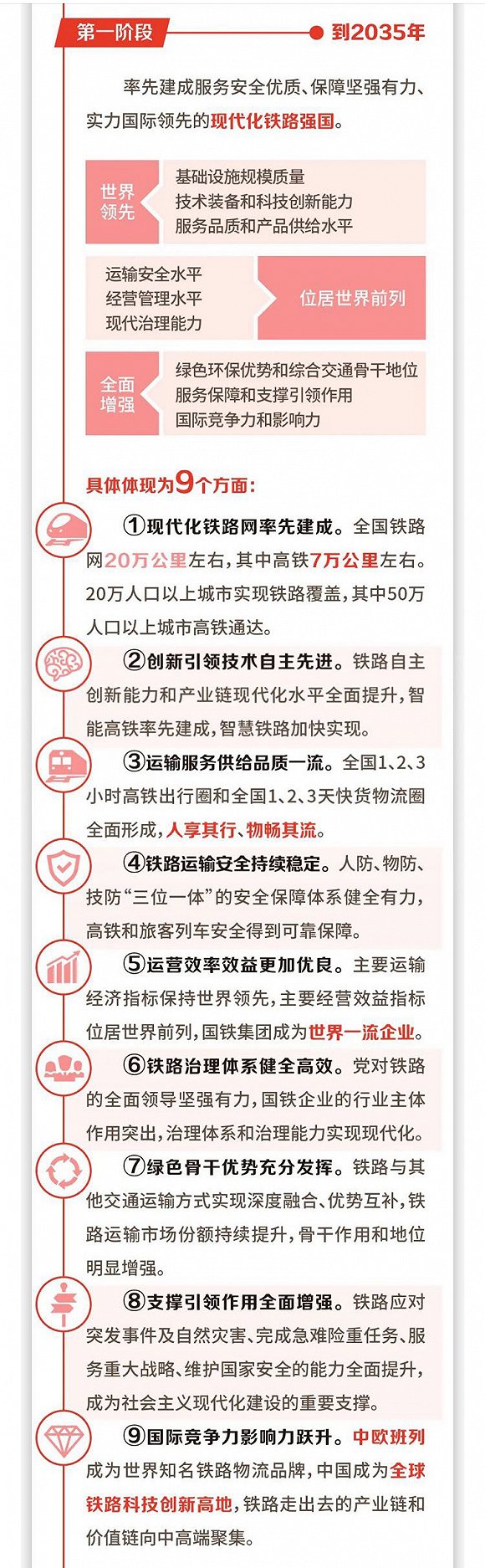 《规划纲要》明确,从2021年到本世纪中叶,中国铁路建设将分为两个阶段,第一阶段到2035年,将率先建成现代化铁路强国;第二阶段到2050年,将全面建成更高水平的现代化铁路强国。