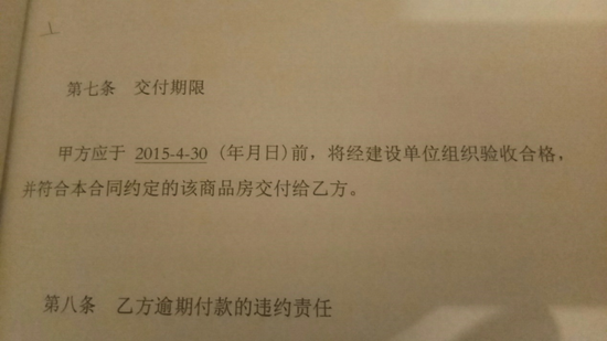 陈丽和老公商量以后,当天就付了1万块定金。对买房一无所知的她甚至不知道这是预售房,以为付款就能入住。陈丽根据自身经济状况,选择了最小的一室一厅户型,65平方米,总价50余万。首付的15.9万元,除了多年来的数万元积蓄,他们还向家里老人、亲戚借了钱才凑齐。2014年6月,陈丽与开发商签订了购房合同,其中约定的交付期限为2015年4月30日。
