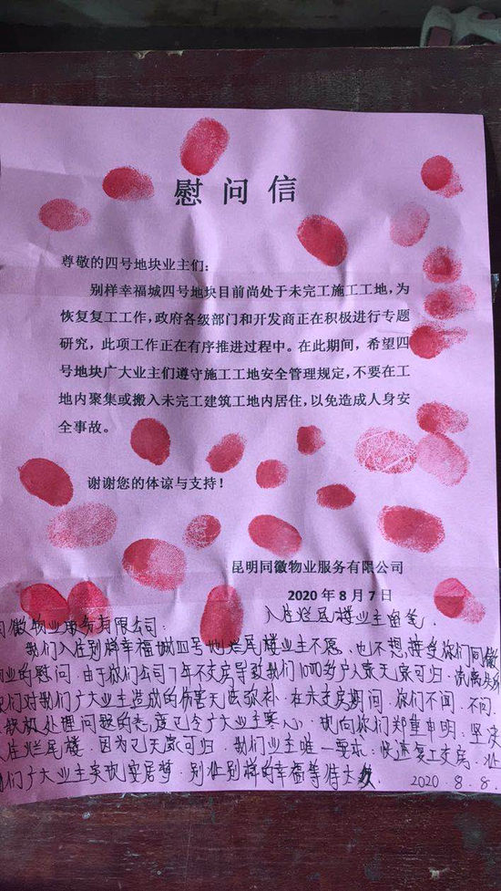 8月7日,4号地块物业管理单位昆明同徽物业公司向业主们发去“慰问信”,信中希望4号地块广大业主们不要在工地内聚集或搬入未完工建筑工地内居住。昆明同徽物业公司的老板与佳达利地产董事李留存之间有着密切关系,该物业公司也因多项劳动争议被官渡区人民法院列入失信名单。