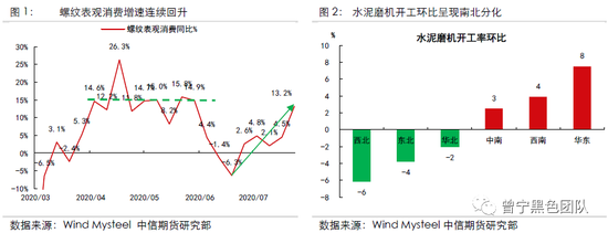 今年梅雨季持续时间长、强度高,对建筑业施工节奏造成明显干扰,6月中旬至7月,螺纹表观消费增速连续7周维持5%以下的低位区间。出梅后,南方降雨强度明显减弱,叠加年中部分项目资金偏紧情况缓解,基建赶工率先启动,从对基建需求反应更为敏感的水泥数据来看,上周南方区域的磨机开工率环比大幅提升,而北方开工率则有所回落,这一点也可以从螺纹社会库存去化速度的区域差异上印证。说明随着季风雨带北移,北方需求的释放暂时仍受到一定抑制,即便如此,在南方需求回归的带动下,上周螺纹表需增速回升至与4-6月旺季接近的水平。虽然8月中下旬全国性高温可能减缓需求回归的步伐,但需求恢复的趋势未改,随着旺季临近,预计未来终端需求仍有较大释放空间,需求全面启动的预期有较大概率兑现。
