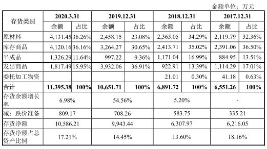 2016年至2020年3月31日,狄耐克存货金额分别为5373.87 万元、6216.05万元、6307.97万元、9943.44万元、1.06亿元,占总资产比例分别为22.02%、18.16%、13.60%、14.45%、17.21%。