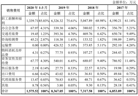 公司称,2018年和2019年,公司销售费用分别为7317.58万元和8367.05万元,分别较上年增长463.69万元和1049.47万元,主要是职工薪酬和福利的增长。