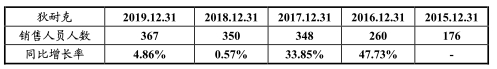 报告期初,公司销售人员人数259人,2017年至2019年末,公司销售人员人数分别为348人、350人和367人,呈快速增长趋势。