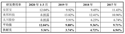 2016年至2020年1-3月,狄耐克研发费用分别为2330.75万元、2643.72万元、2155.78万元、2299.71万元、533.21万元,研发费用率分别为8.11%、6.94%、4.72%、3.74%、5.36%。