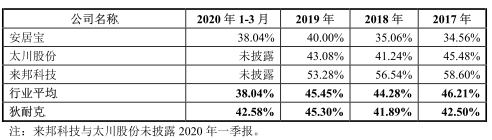 2017年至2020年1-3月,同行业公司毛利率均值分别为46.21%、44.28%、45.45%、38.04%。